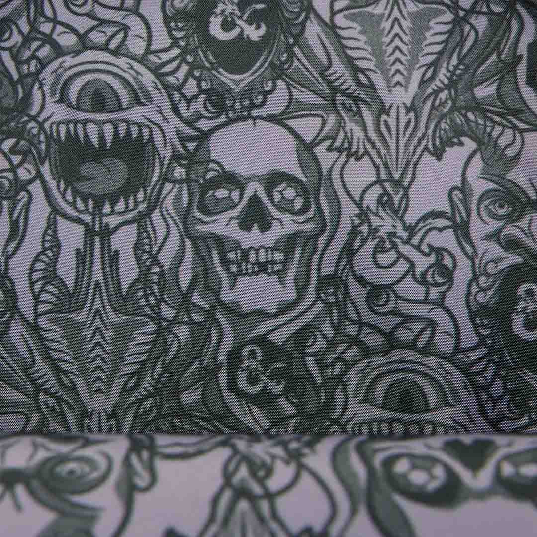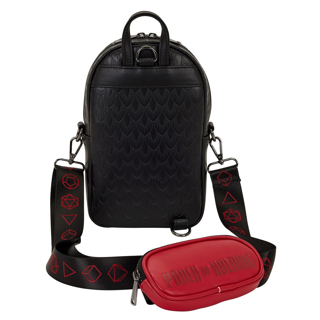 This sling is inspired by Dungeons & Dragons. You'll find a molded metal rivet of the D&D logo on the front. A coin bag is attached to the strap that says "Pouch of Holding." Along the strap, you'll find the outlines of the various dice you use in the game!