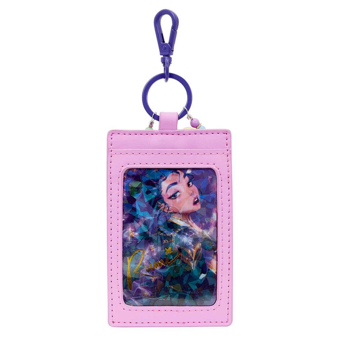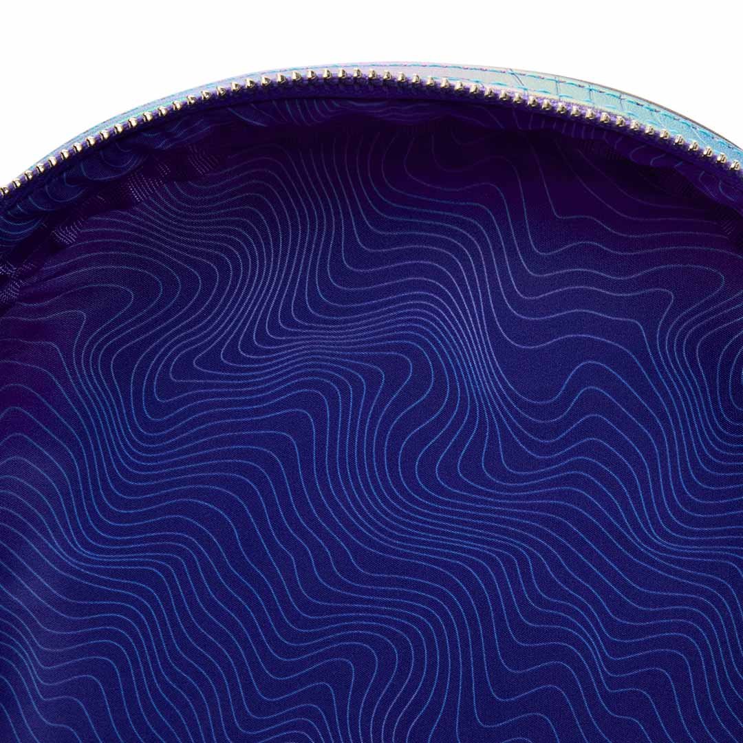 On this bag, you'll find iridescent appliques of Rumi, Mira, and Zoey. Purple highlights the side pockets, zipper, and straps. Star appliques are also on the straps. Attached to the bag is a photo card bag charm with three cards, one for Rumi, one for Mira, and one for Zoey. There's also a beaded charm attached with charms of a heart, bell, and turtle.