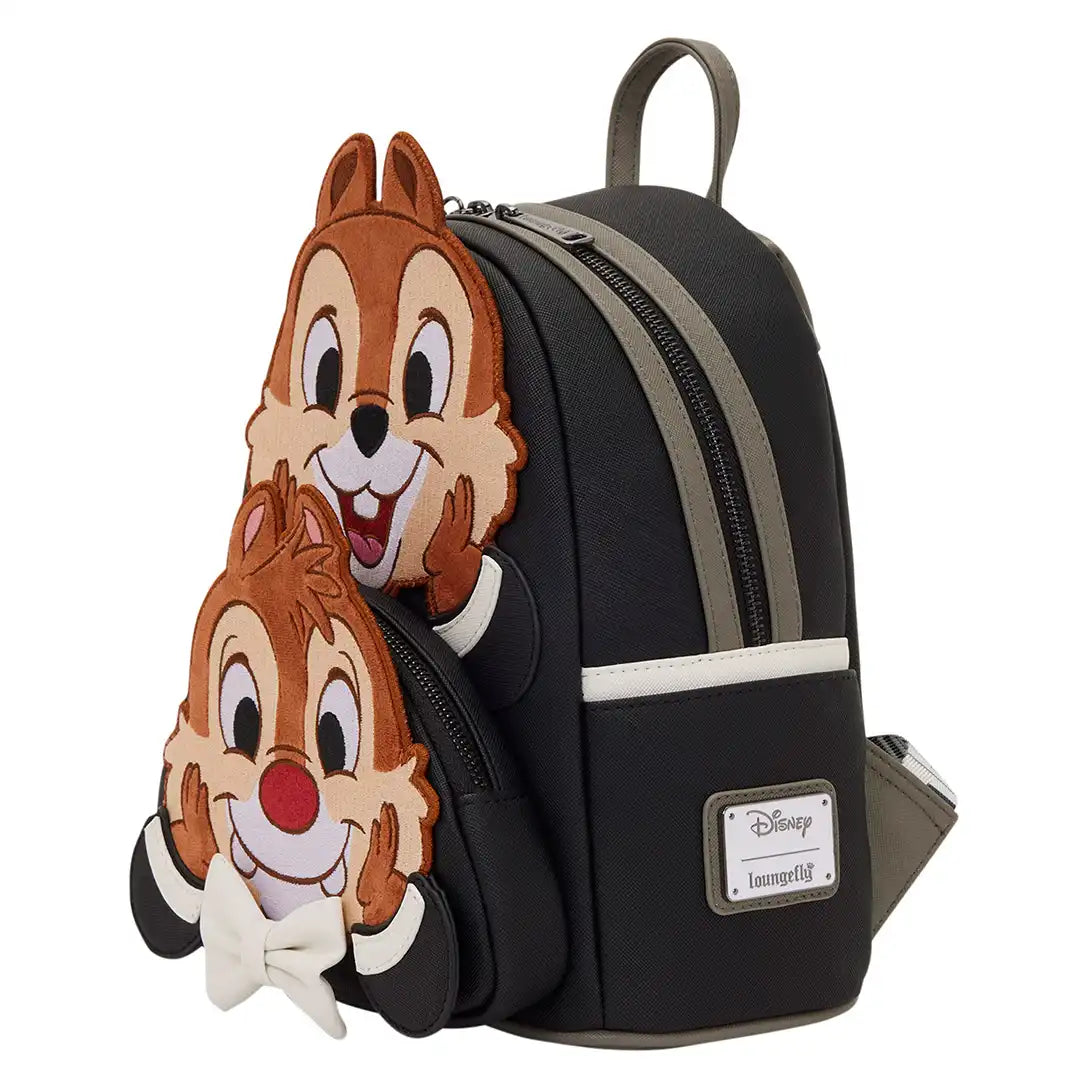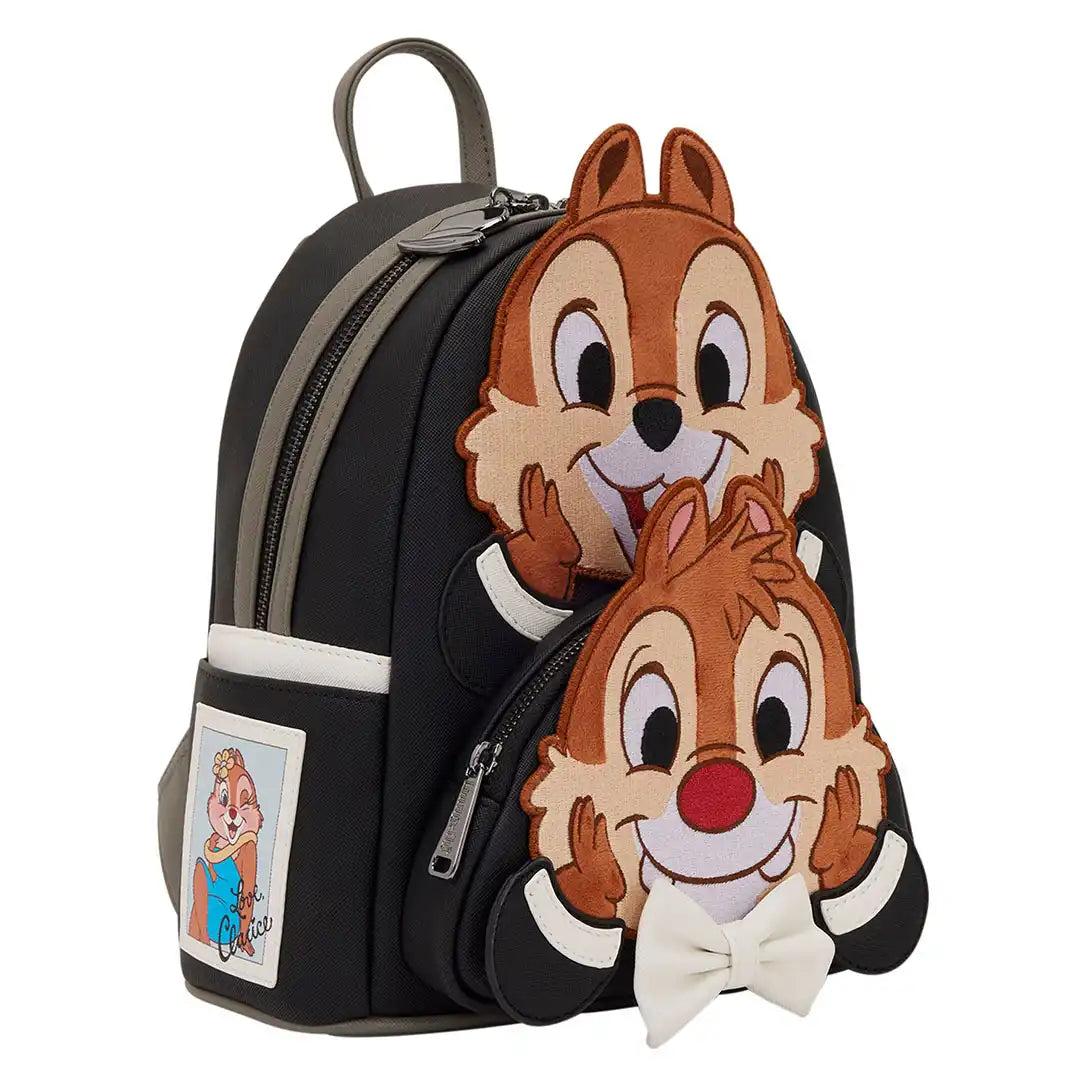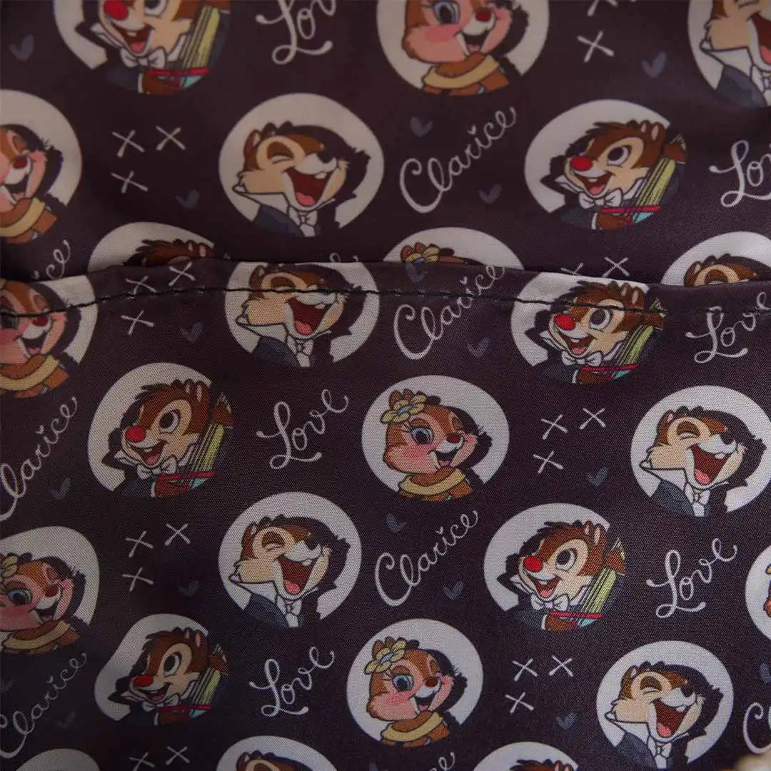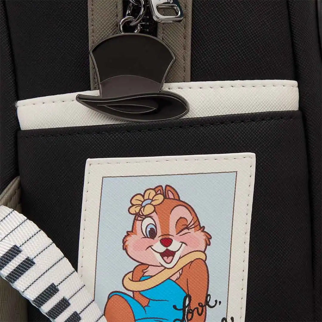 You'll find Chip 'n' Dale on the front of the bag, leaning one on top of the other. They feature embroidered facial details and plush material. The rest of the bag is inspired by their suits. On the side, you'll find an image of Clarice that's signed by her. For an extra cute detail, the zipper pull is a top hat!