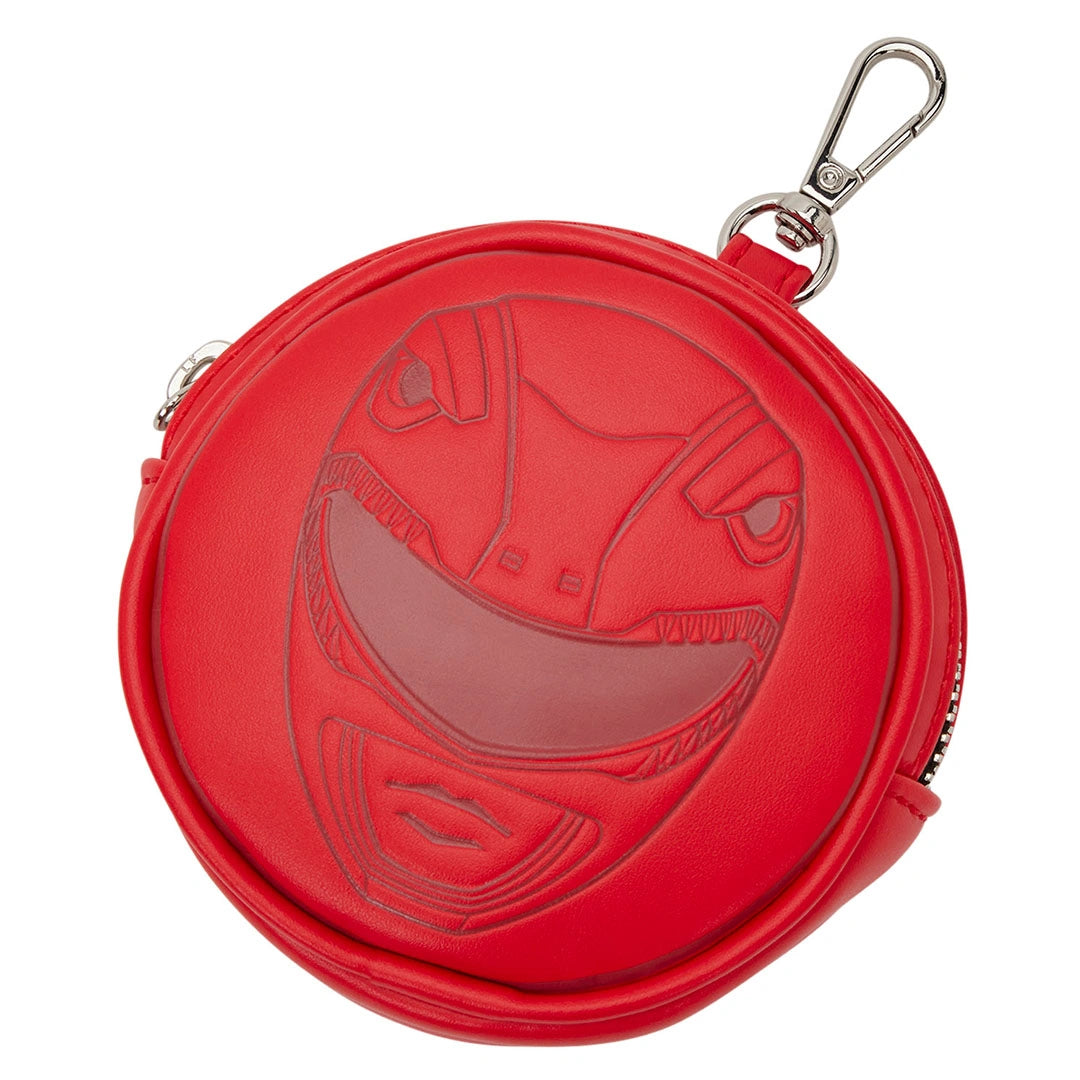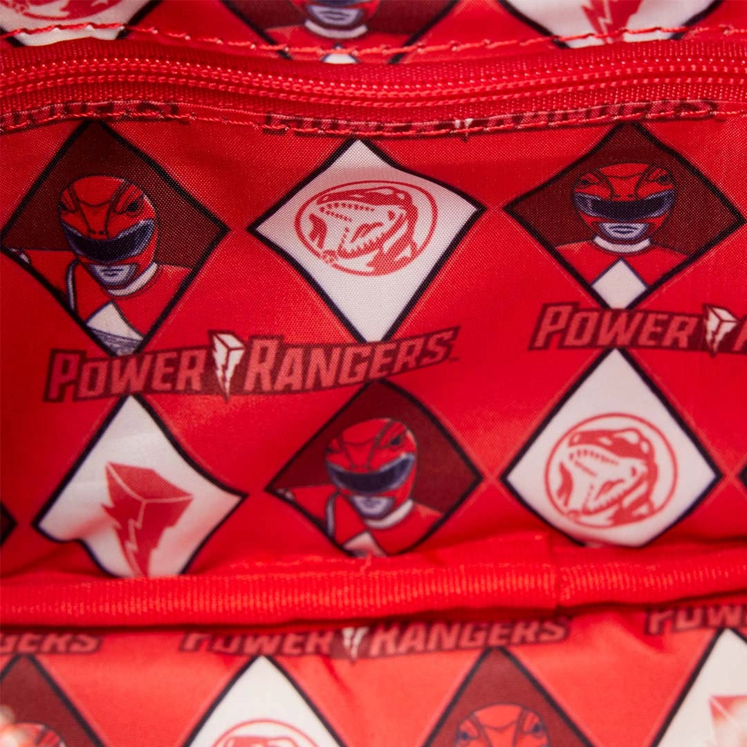 Live your best Power Rangers life with this sling. On the front, you'll find a gold foil dinosaur, surrounded by a red ring that says "Power Rangers" within it. Metallic silver material surrounds the image. Attached is a red coin bag that features the Red Power Ranger's helmet on it. The crossbody strap says, "It's Morphin Time." You'll find another image of the Red Power Ranger's helmet on the back of the bag.