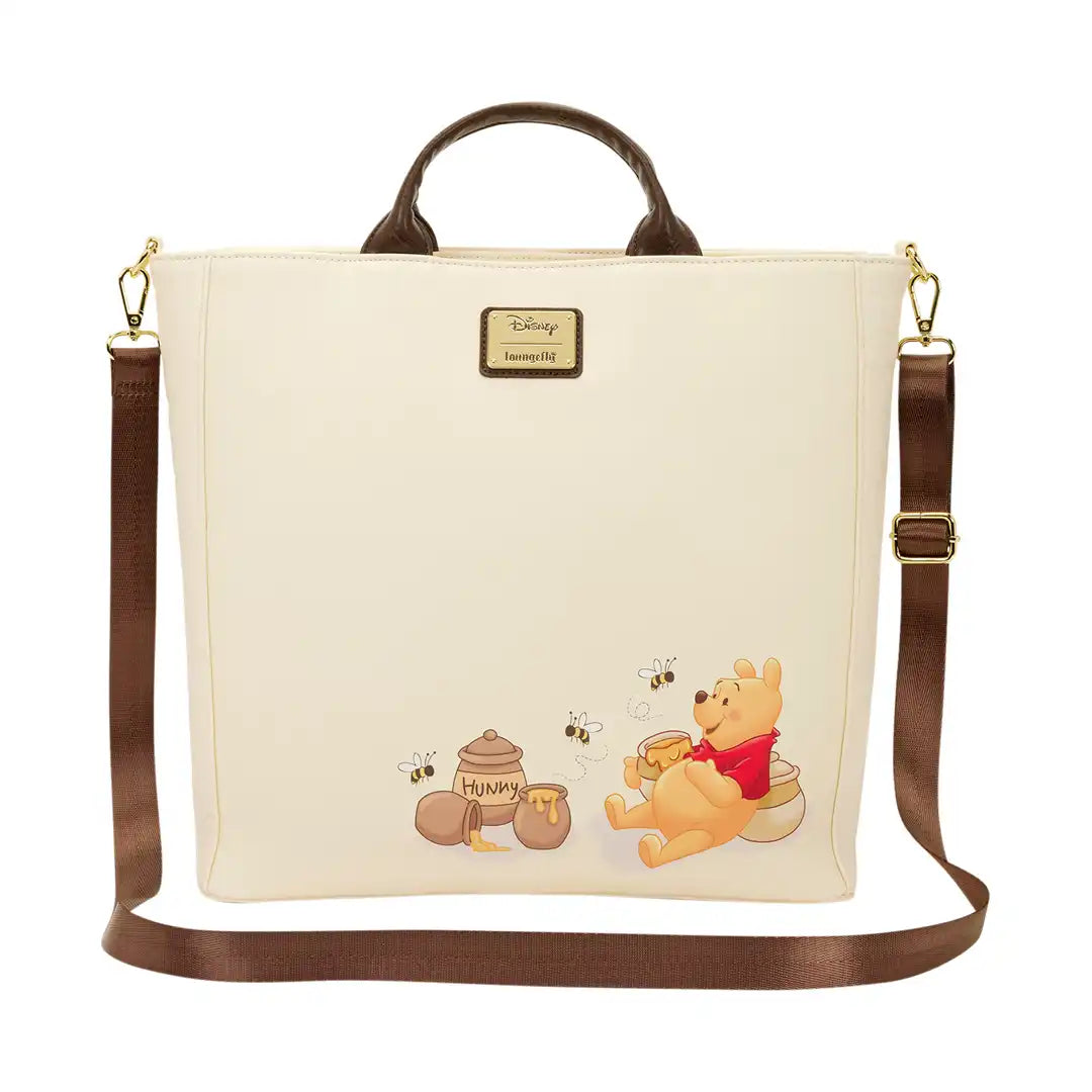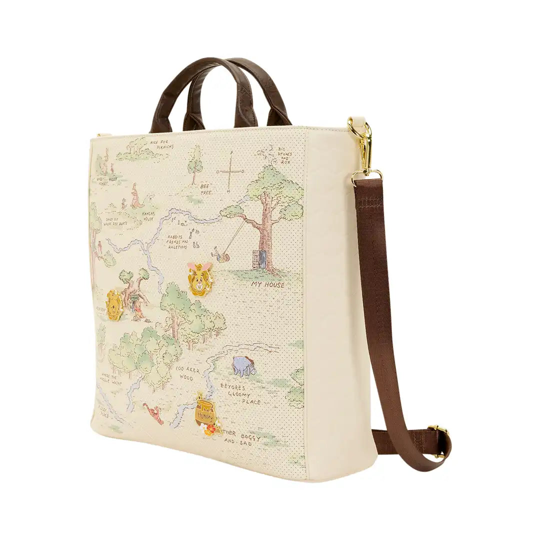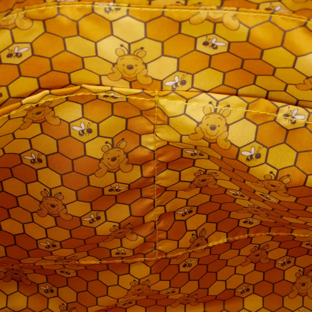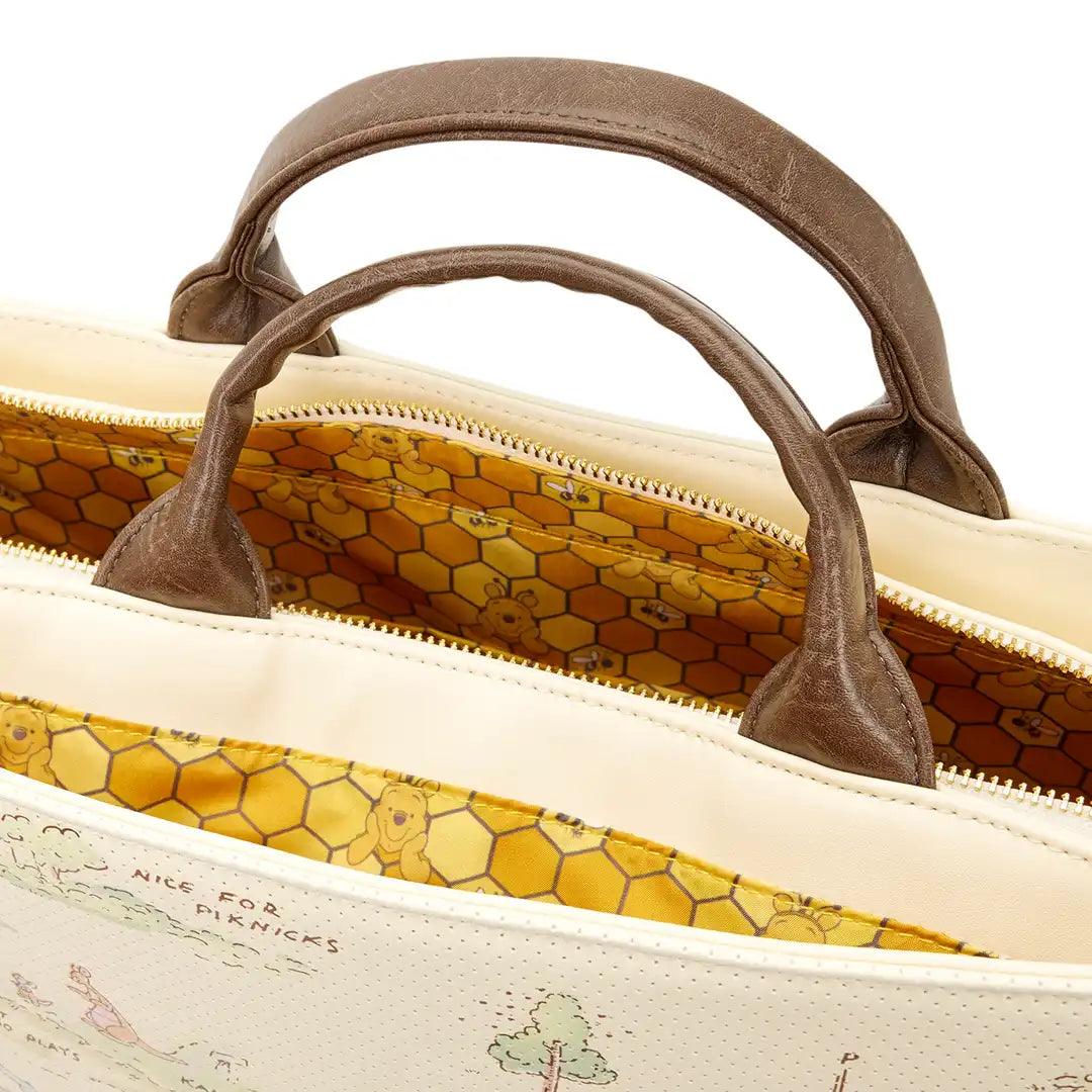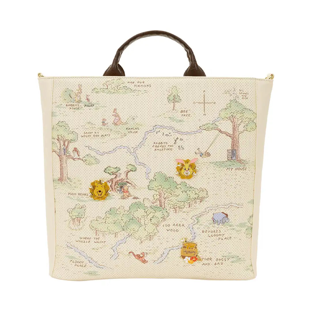 This tote bag makes every workday oh-so-cute! You'll find a map of the Hundred Acre Wood on the front. The material is perforated so you can put pins in it! Three enamel pins are included with this bag to get you started, and you can add whatever pins you already own! You'll find a debossed honeycomb pattern on the sides. Turn the bag around to find an image of Winnie the Pooh with a bunch of hunny pots and bees!
