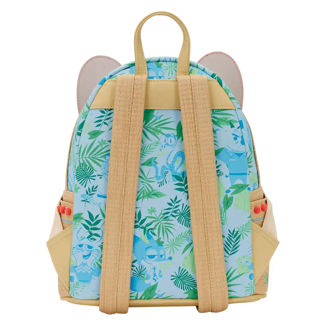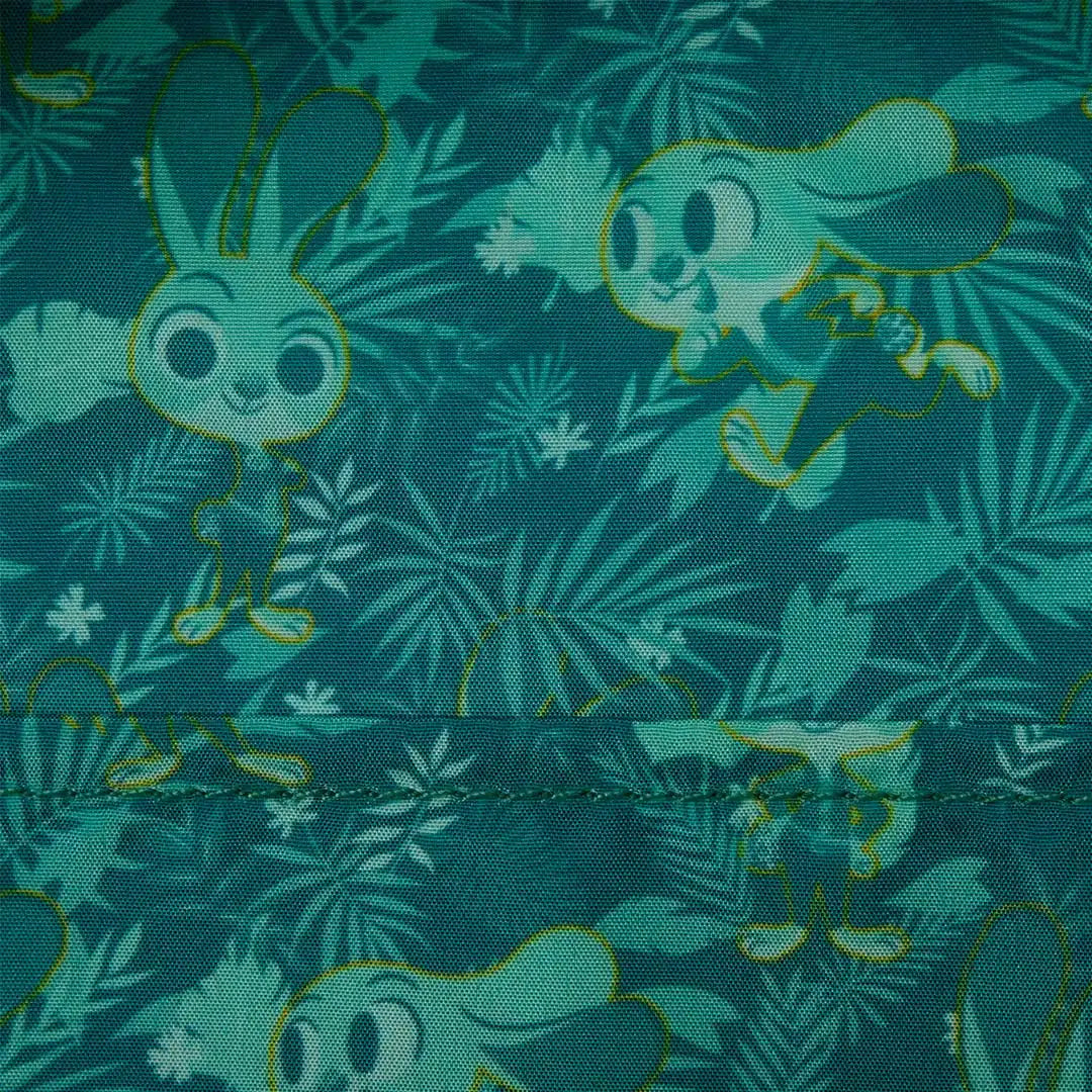 This mini backpack features a Hawaiian print over the body of the bag with woven material on the side pockets and straps. The front pocket features Judy's face with embroidered facial details and 3D applique ears that stick up! On the side pocket, you'll find embroidered details like a palm tree and flowers. This is a super fun bag to carry along with you any day!