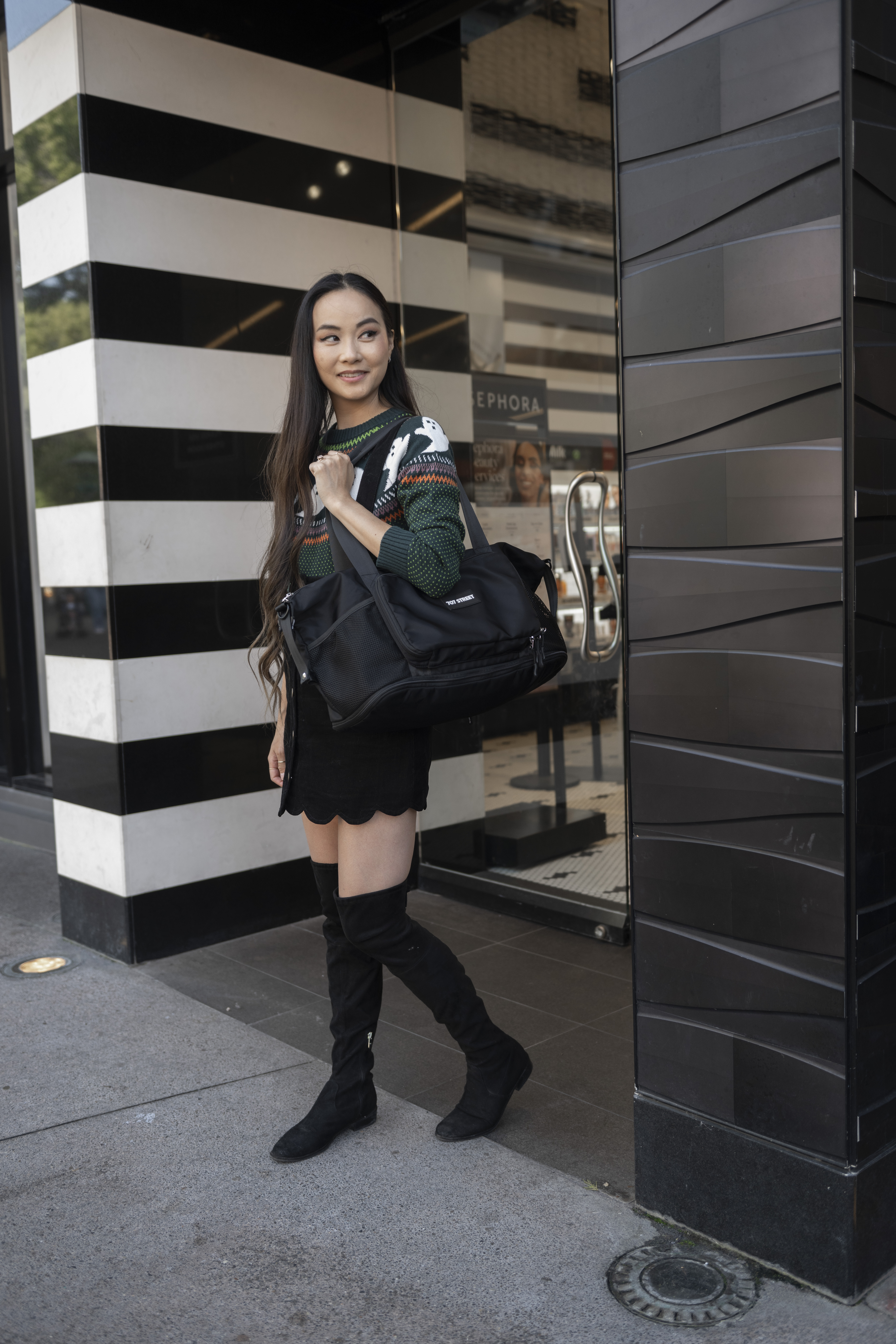 A functional, go-to bag with two large exterior pockets in addition to the main interior compartment. Has an interior laptop sleeve with velcro closure that fits 13/14” laptop in a puffy case.