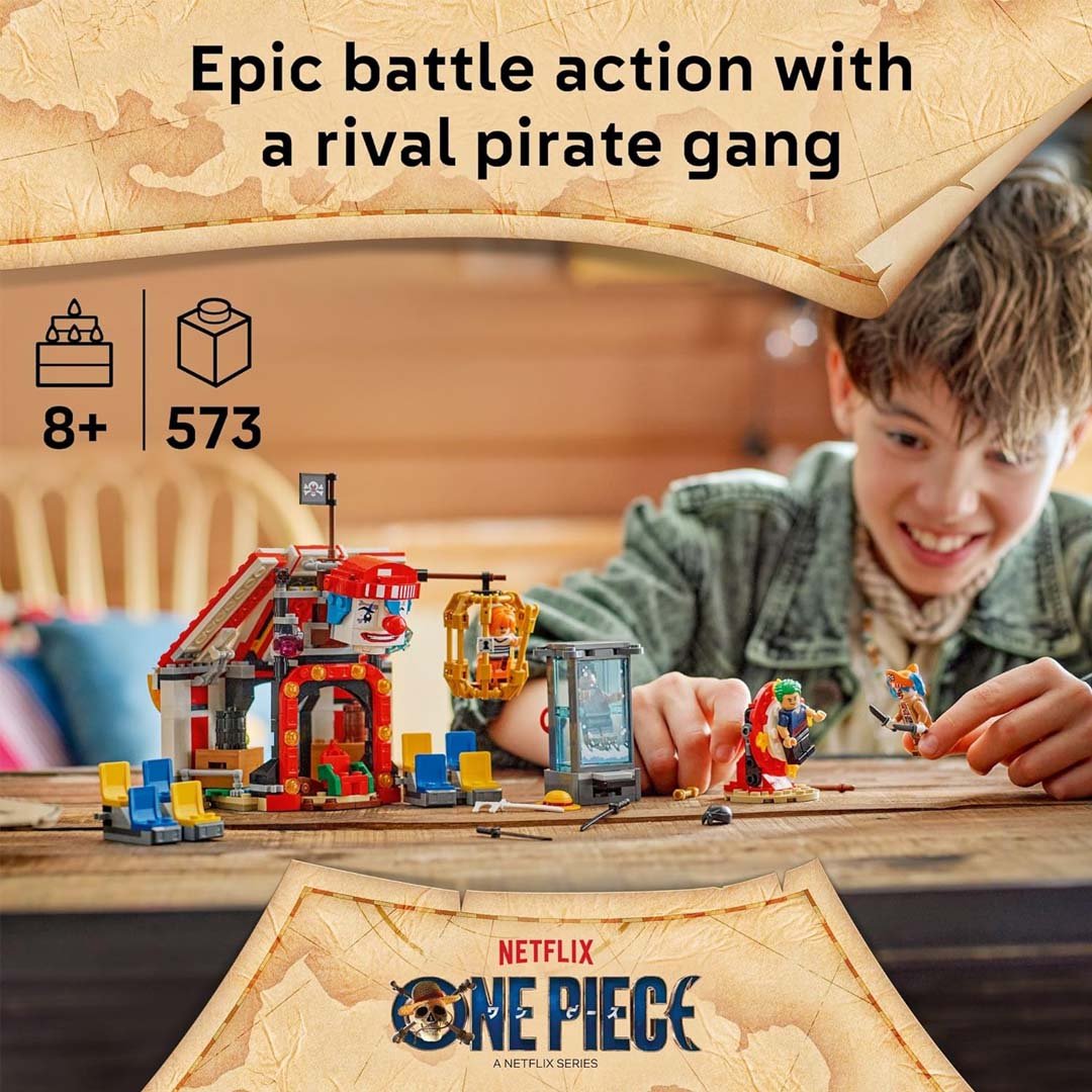 The set includes Monkey D. Luffy, Roronoa Zoro, Nami, and Buggy the Clown minifigures with character-appropriate accessories. Stage Straw Hat vs. Buggy showdowns: free Luffy from the tank, rescue Zoro from the wheel, save Nami from the cage, and let Buggy command the ring from his throne.