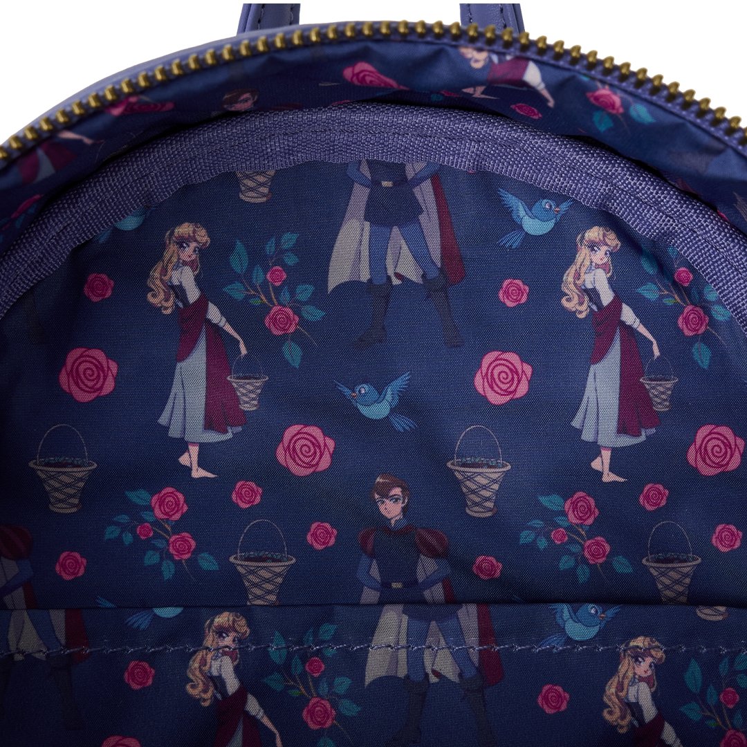 Gorgeous pink roses are embroidered around an image of Prince Phillip and Princess Aurora from Disney's Sleeping Beauty. More floral details appear on the side pockets over a woven faux leather background for a more dynamic design.
