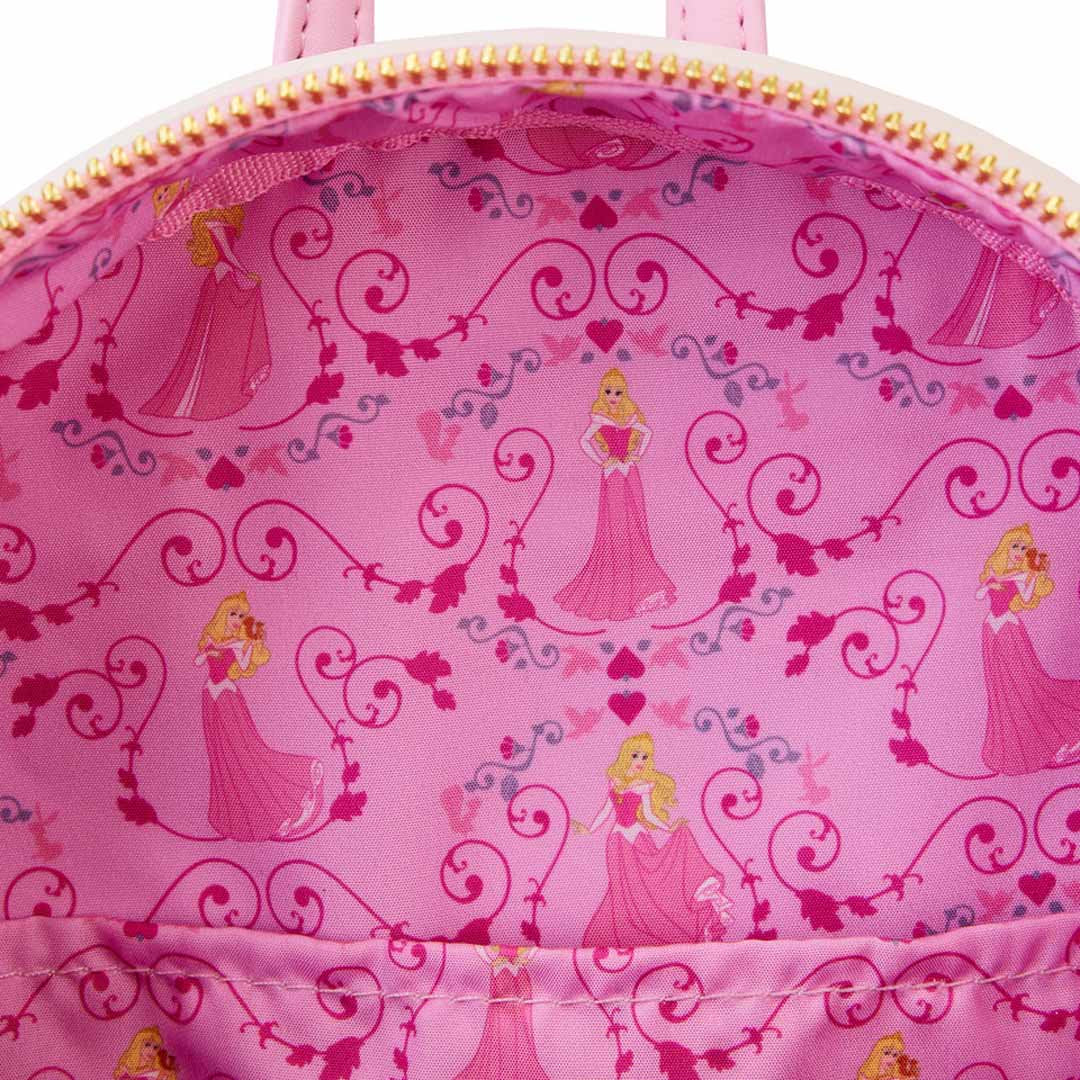Walk once upon a dream with the Loungefly Disney Sleeping Beauty Princess Lenticular Mini Backpack. This faux leather Loungefly mini backpack features Princess Aurora peering into two memorable scenes from the animated classic. At one angle, you'll see her dancing with Prince Phillip and at another, she's about to prick her finger on the spindle of a spinning wheel. You'll also find a few familiar friends on the side pockets, with Aurora and Phillip both making an encore appearance on the back.