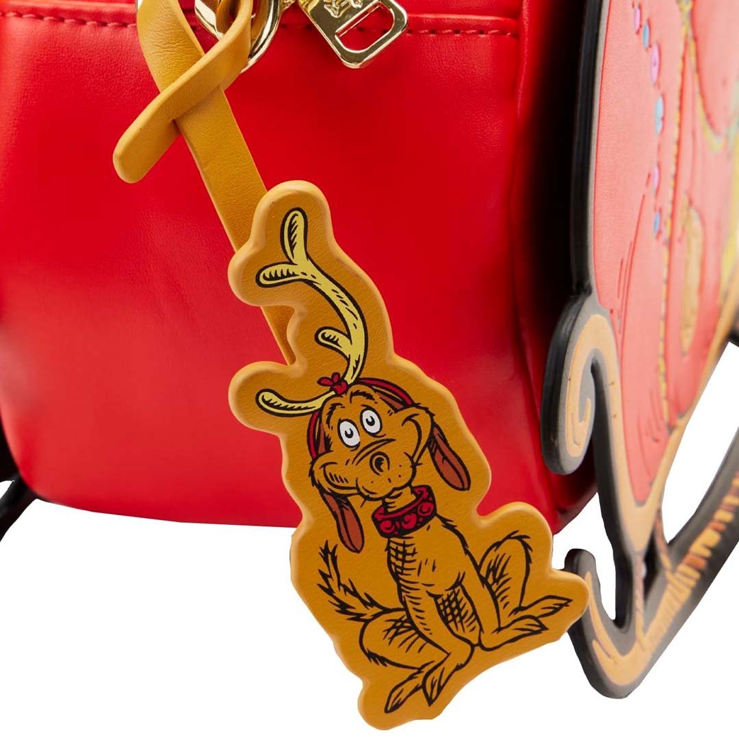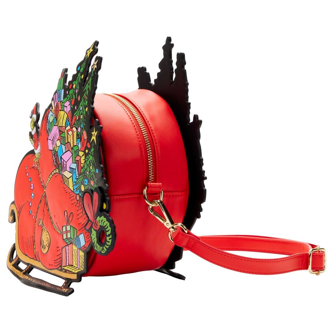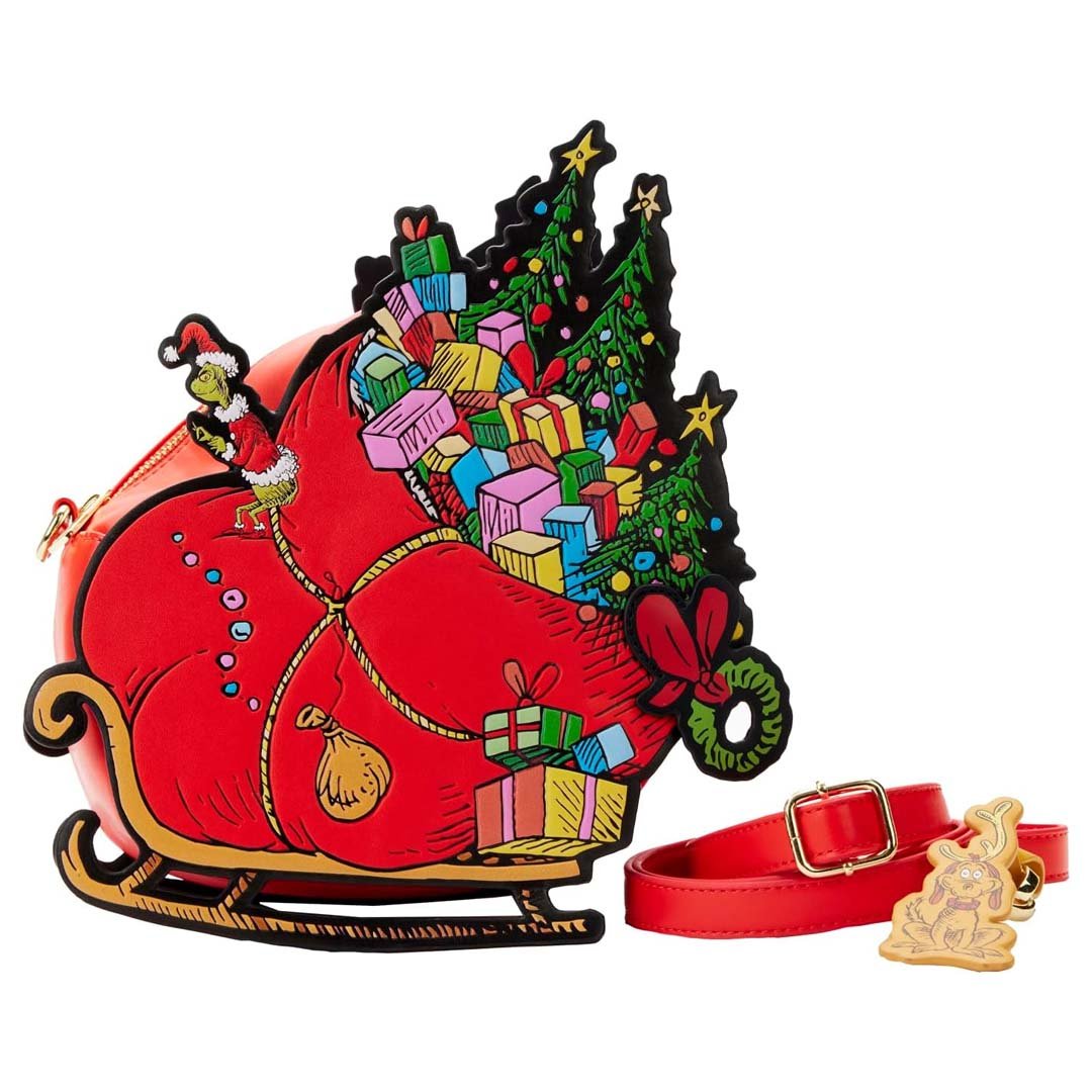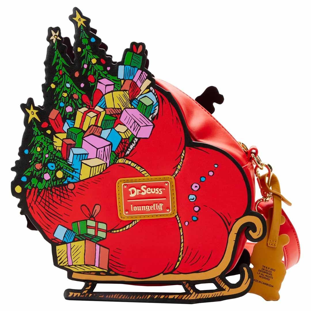 Uh oh! It looks like the mean, old Grinch has stolen all the presents from Whoville on the Loungefly Dr Seuss Grinch Sleigh Crossbody! This faux leather bag features a large sleigh and Santa sack overflowing with holiday decor and Christmas presents. There's even a Max leather bag charm! You'll find applique, debossed and printed details throughout. You'll also find a large storage compartment and adjustable shoulder strap, making it perfect for carrying around all of your Whobiliation goodies!