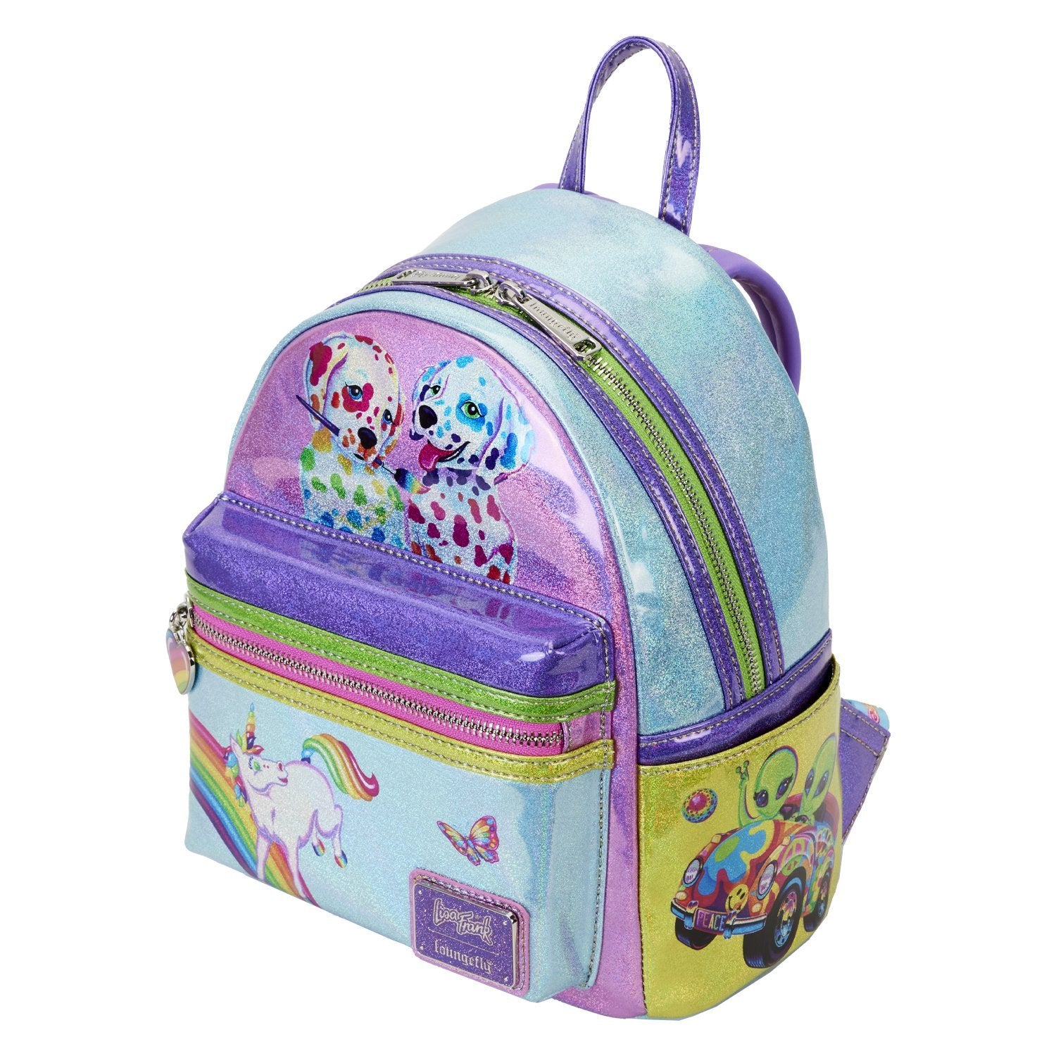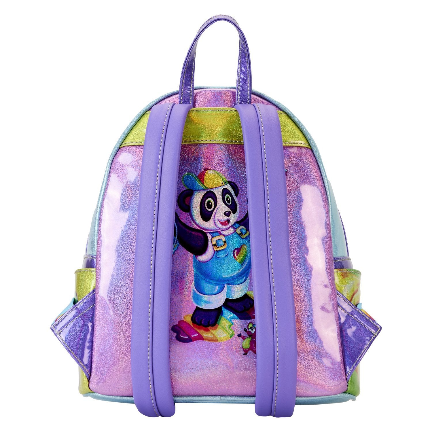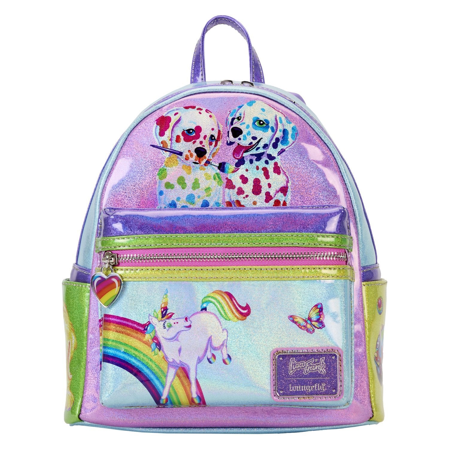 There's no better way to describe the Lisa Frank brand than a color palette of vibrant colors and an array of whimsical designs! That's exactly what you'll find on the gorgeous Loungefly Lisa Frank Color Block Mini Backpack! This faux leather Loungefly mini backpack features some of your favorite characters against stunning, holographic colors. The top, back and each individual pocket come with their own unique little design with a beloved friend! You'll spot Markie, Painter Bear, Spotty and Dotty and more! Lisa Frank fans - this one is for you!