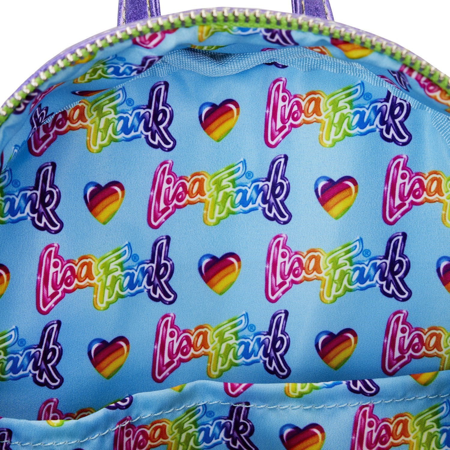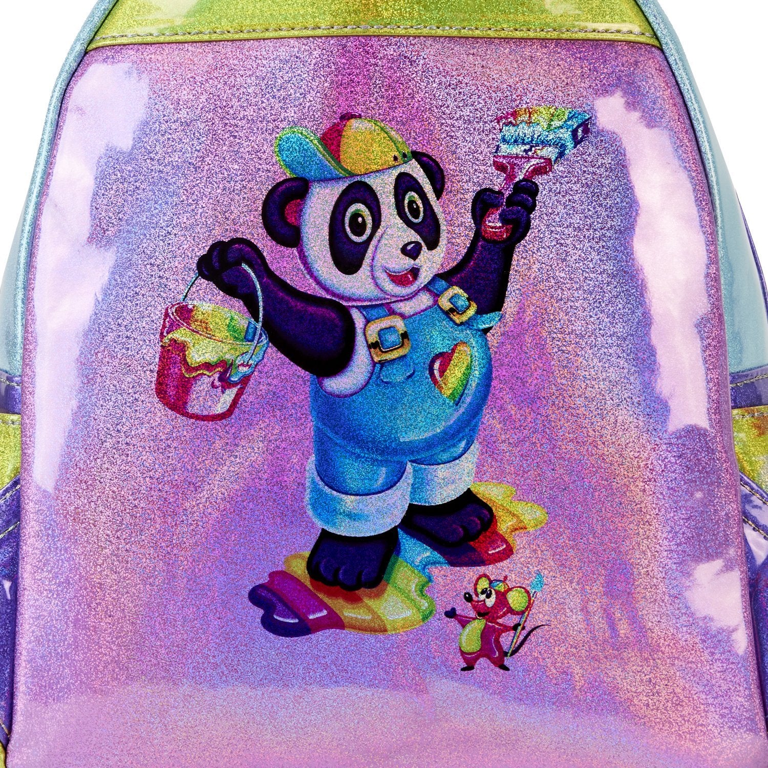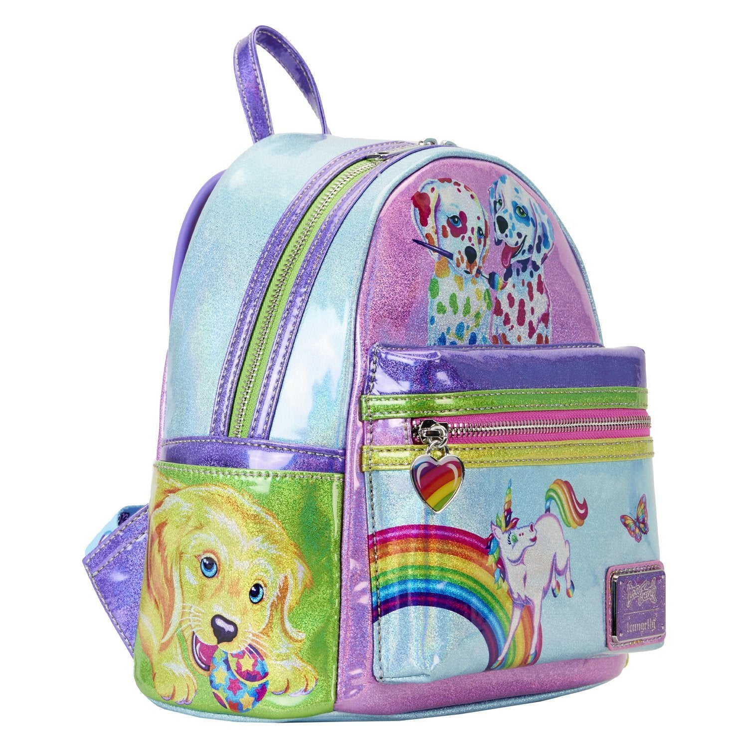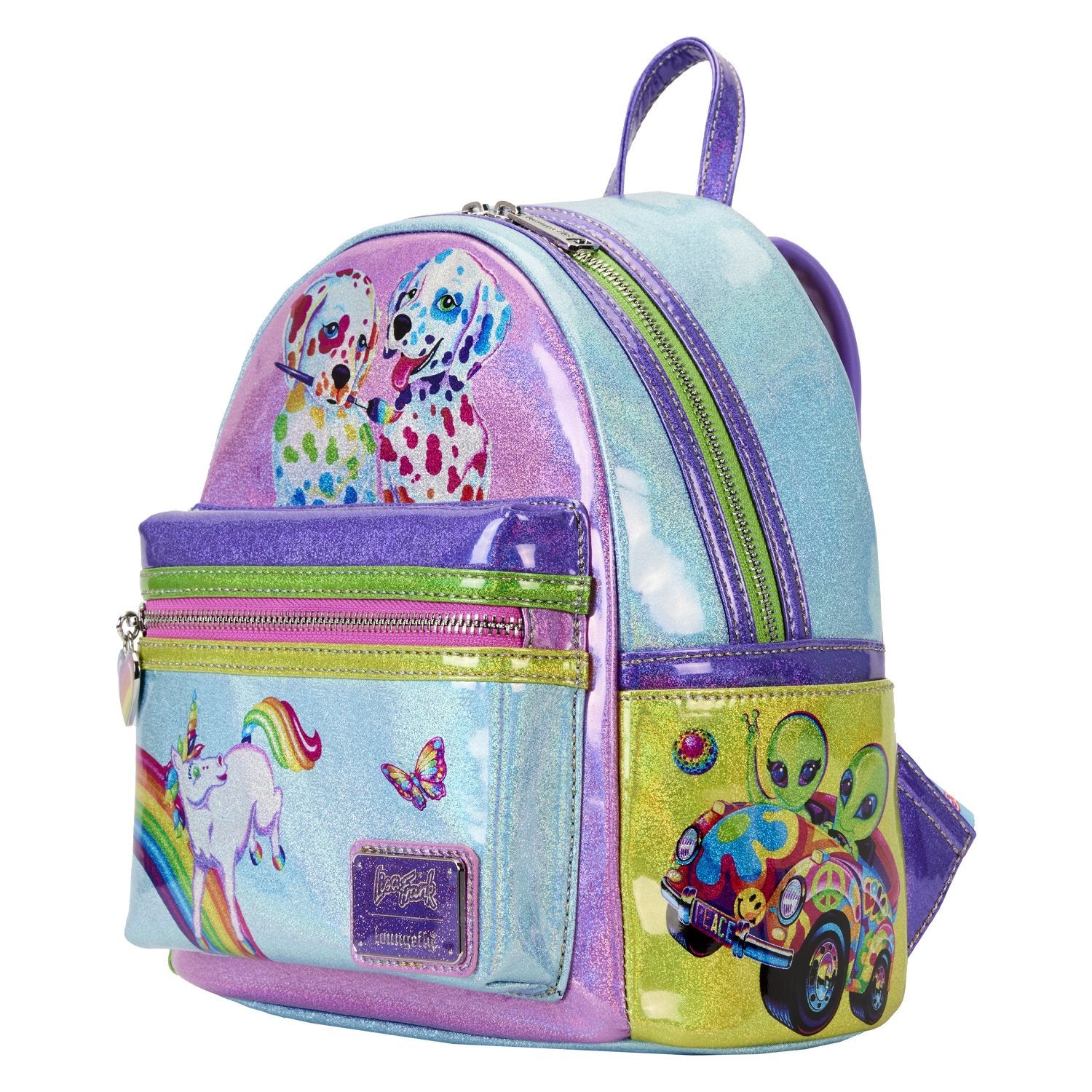 There's no better way to describe the Lisa Frank brand than a color palette of vibrant colors and an array of whimsical designs! That's exactly what you'll find on the gorgeous Loungefly Lisa Frank Color Block Mini Backpack! This faux leather Loungefly mini backpack features some of your favorite characters against stunning, holographic colors. The top, back and each individual pocket come with their own unique little design with a beloved friend! You'll spot Markie, Painter Bear, Spotty and Dotty and more! Lisa Frank fans - this one is for you!