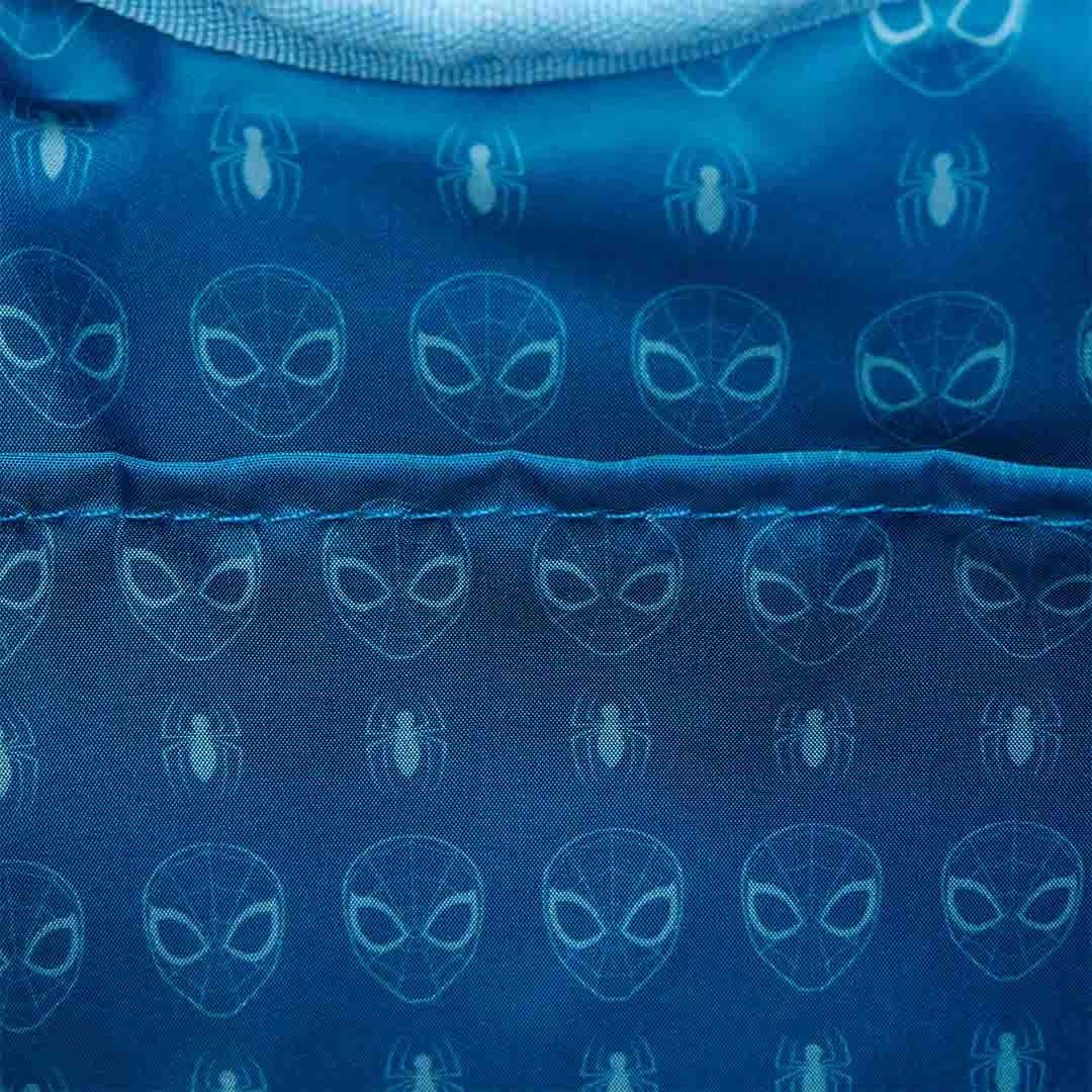 This crossbody bag is in the shape of a heart and features Spider-Man's mask! It's covered in sherpa material. Along the strap, you'll find various symbols of Spider-Man in squares that look stitched together. This is a super sweet accessory that's perfect to show off your favorite super hero!