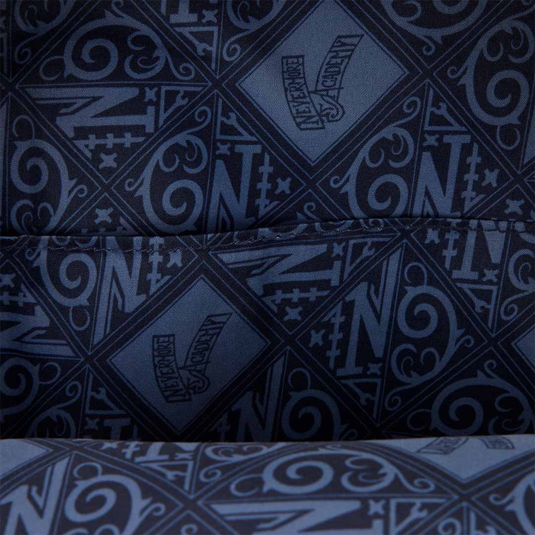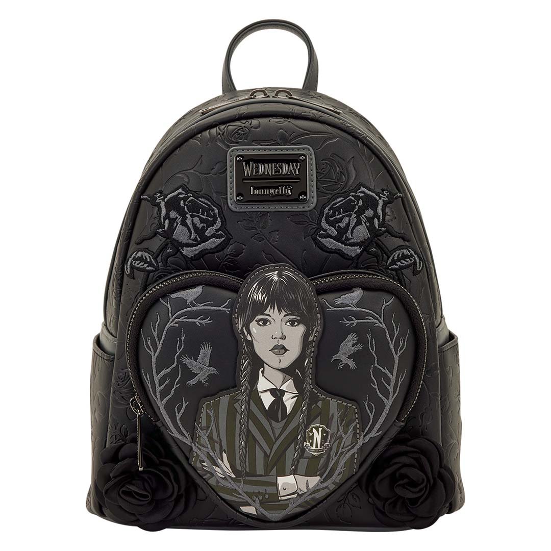 This mini backpack features everyone's fav: Wednesday! She appears on the front heart-shaped pocket. All over the bag, she's surrounded by embossed and embroidered floral details. There are even 3D roses on the front!