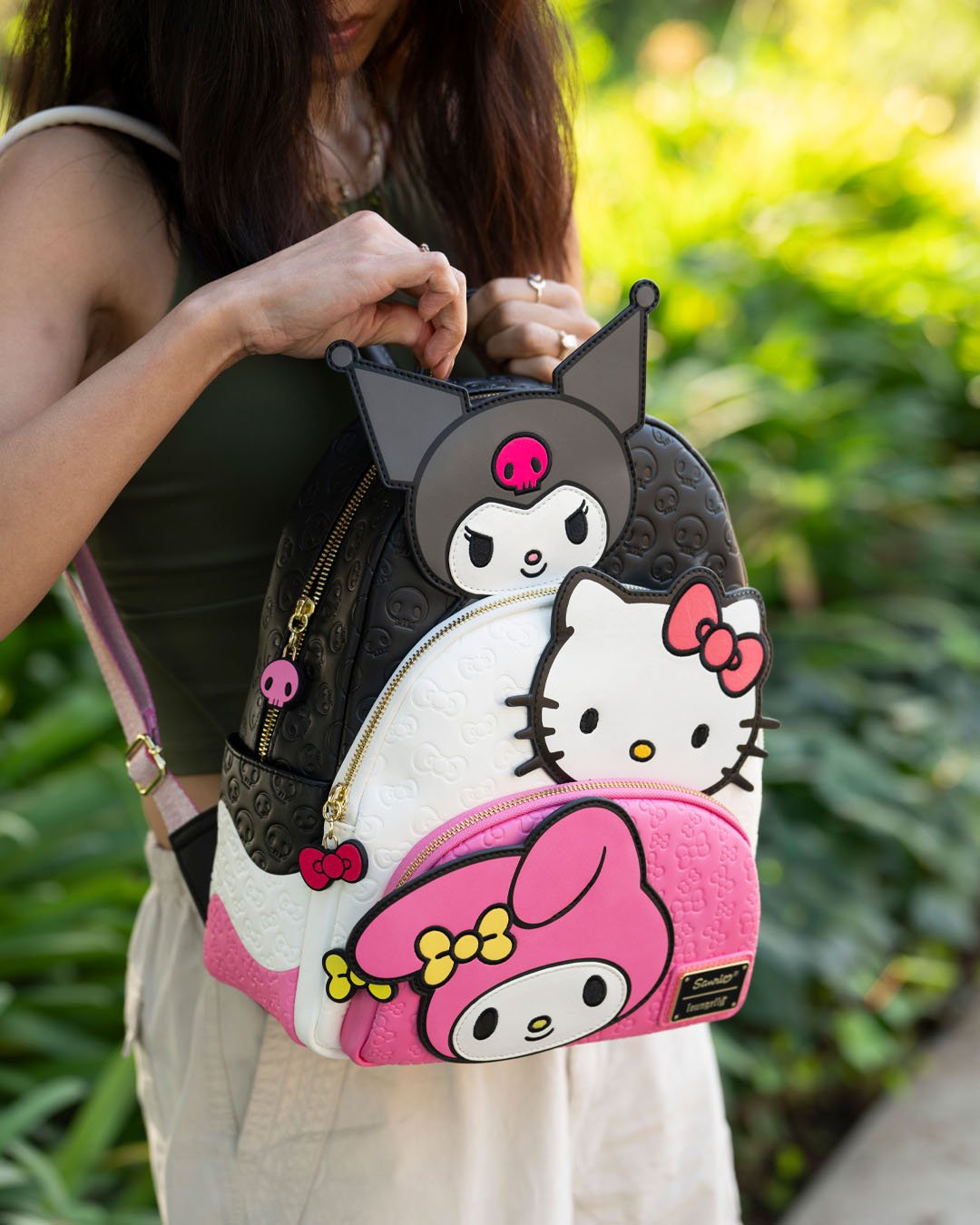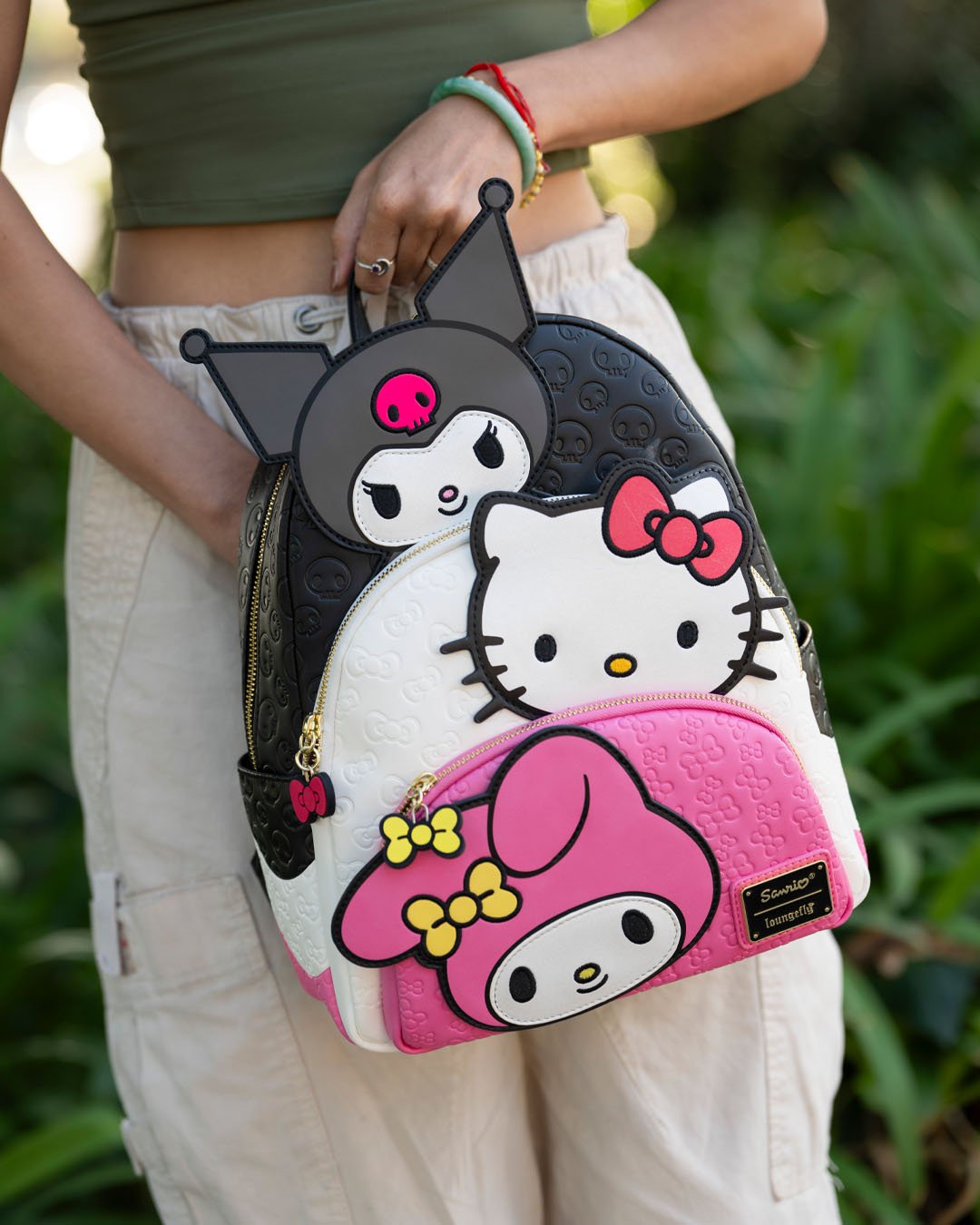 Sweet, spooky, and oh-so-cute — all in one bag! Meet the Loungefly Sanrio Kuromi, My Melody, and Hello Kitty Glow In The Dark Triple Pocket Mini Backpack – 707 Street Exclusive, a playful design that brings together three Sanrio favorites in one irresistible piece.