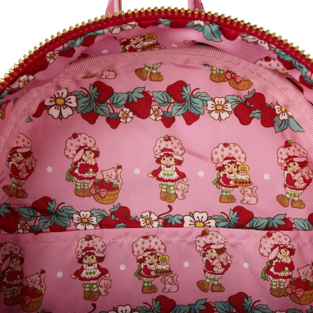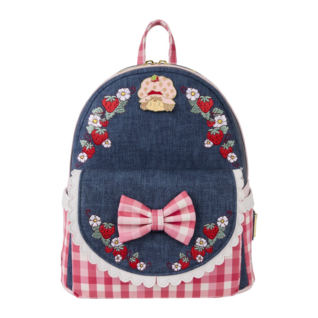 Find a mix of blue denim and pink gingham on this bag, with embroidered strawberries at the top of the bag and along the flap of the front pocket. Look closely and you'll find an enamel charm of Strawberry Shortcake at the top and a 3D bow on the front pocket! Scalloped edges along the front and side pockets make for an extra sweet detail.