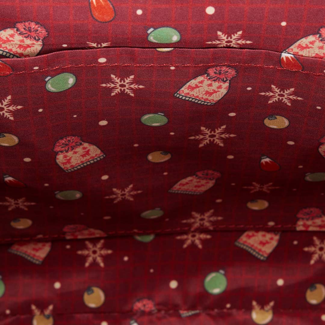 The body of this crossbody bag features images of Kevin, Harry, and Marv amongst other seasonal designs inspired by a holiday sweater. The top flap features metal charms of various items from the movie, like the McCallister home, pizza, and an iron! A 3D bow attached to the top handle brings the look together.