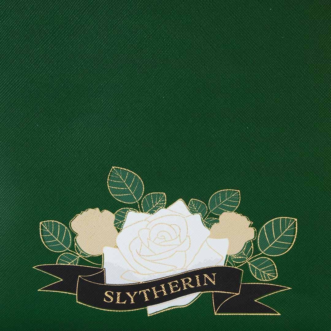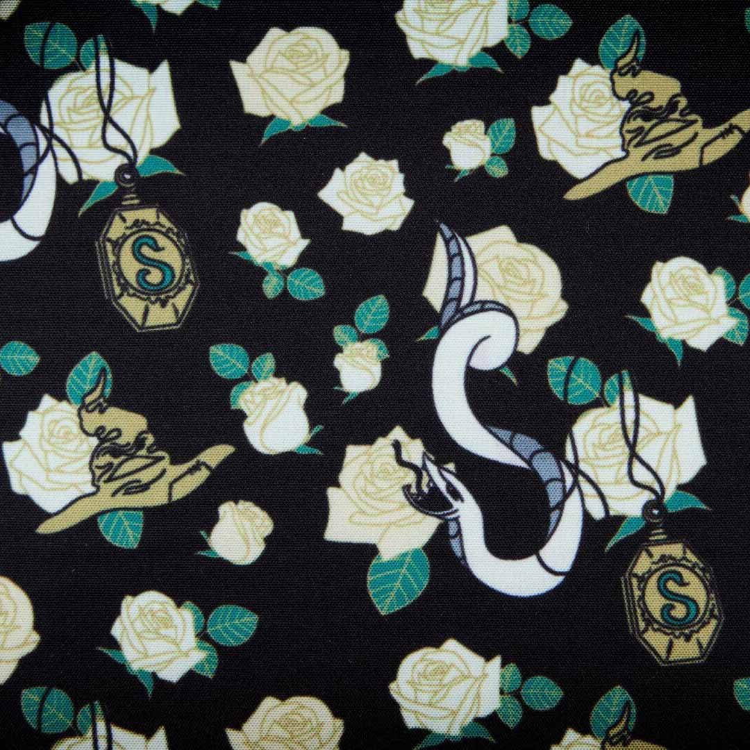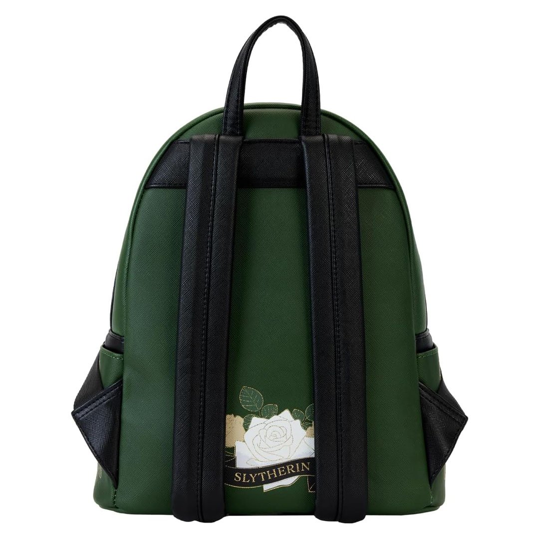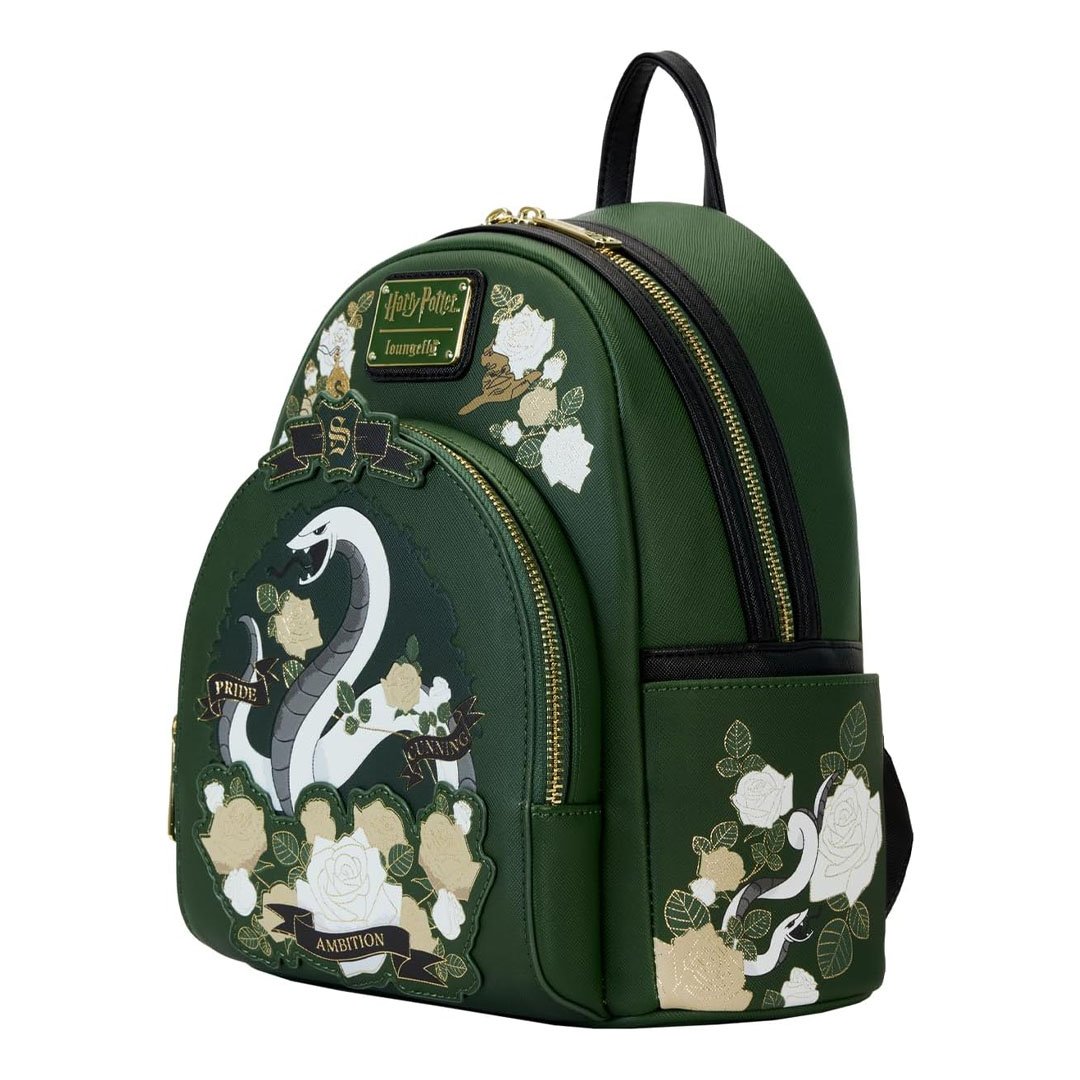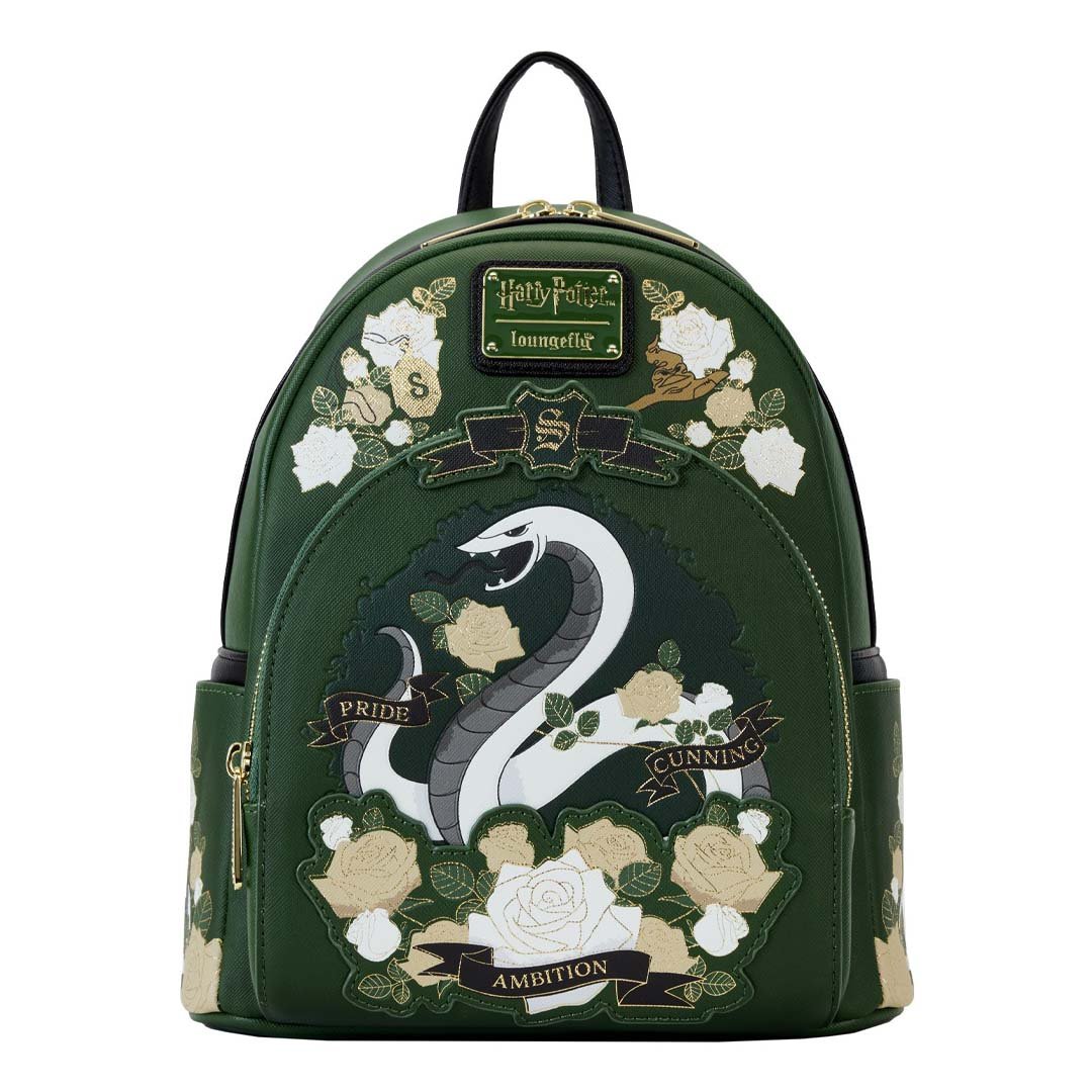 Stop and smell the roses while representing your House! The Loungefly Warner Brothers Harry Potter Slytherin House Tattoo Mini Backpack is perfect for growing your love of all things Harry Potter. On the front of this elegant forest-green backpack, an applique Slytherin symbol of the snake appears to strike among white and pale gold-colored flowers. Banners bearing the traits of the Slytherin House appear as well, including Pride, Cunning, and Ambition. Above, you’ll find more flowers and a sorting hat. Foil details add an elevated touch. On the side pockets, the Slytherin symbol, among the flowers, makes another appearance. The reverse side of the backpack carries a banner that says “Slytherin,” which is nestled among flowers.